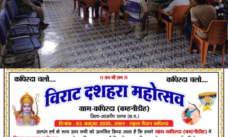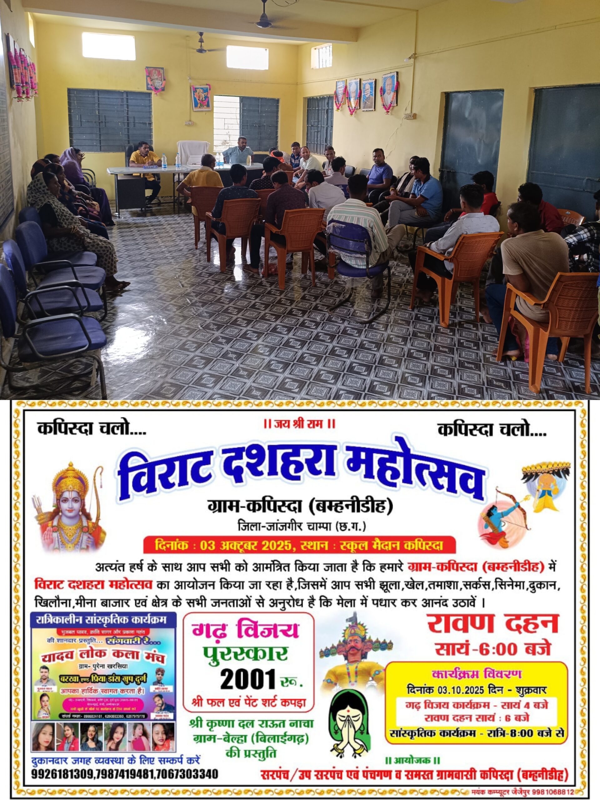 जांजगीर-चांपा। 3 अक्टूबर 2025 को ग्राम पंचायत कपिस्दा में आयोजित होने वाले दशहरा एवं गढ़ विजय कार्यक्रम की तैयारियों को लेकर ग्राम पंचायत भवन में विशेष शांति समिति की बैठक आयोजित की गई। इस बैठक की अध्यक्षता ग्राम पंचायत सरपंच ने की।
