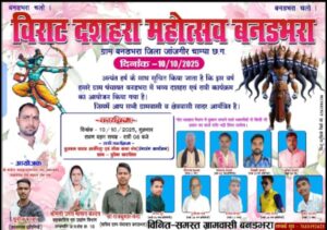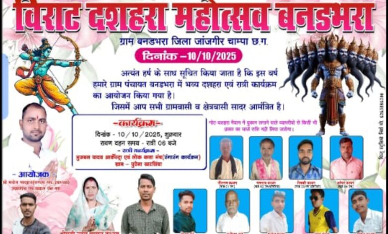 “विराट दशहरा महोत्सव” ग्राम बनडभरा में मनाया जाएगा स्थान — ग्राम पंचायत बनडभरा, जिला जांजगीर-चांपा (छत्तीसगढ़)दिनांक — 10 अक्टूबर 2025