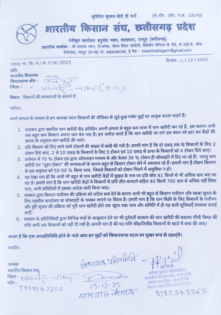 भारतीय किसान संघ बम्हनीडीह द्वारा 6 सूत्रीय मांगों का ज्ञापन सौंपा गया