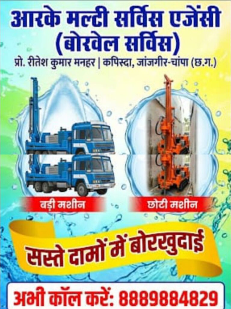 जांजगीर-चांपा (कपिस्दा): ग्रामीण और शहरी क्षेत्रों में पेयजल की बढ़ती समस्या के बीच आर के मल्टी सर्विस एजेंसी लोगों के लिए राहत बनकर सामने आई है। कपिस्दा (जिला जांजगीर-चांपा) से संचालित यह एजेंसी आधुनिक तकनीक और अनुभवी टीम के साथ किफायती दरों पर बोरवेल खुदाई की सुविधा उपलब्ध करा रही है।