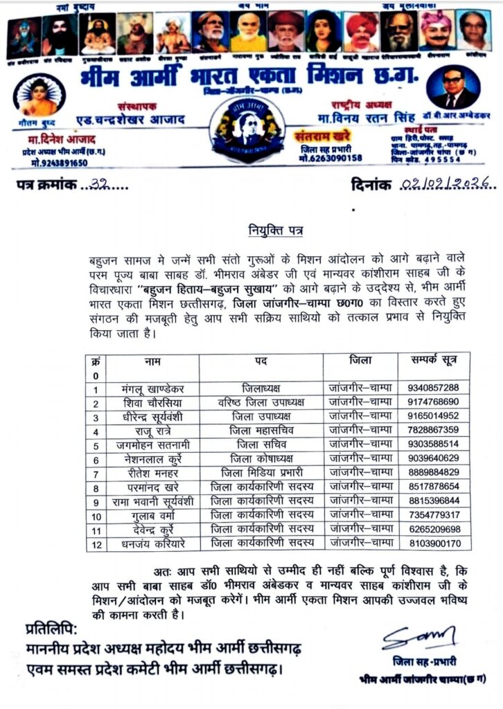 इस नियुक्ति की प्रतिलिपि प्रदेश अध्यक्ष, भीम आर्मी छत्तीसगढ़ एवं समस्त प्रदेश कमेटी को प्रेषित की गई है।