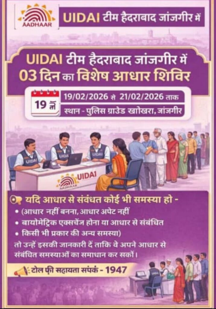 जांजगीर। भारतीय विशिष्ट पहचान प्राधिकरण (UIDAI) की हैदराबाद टीम द्वारा जांजगीर में 03 दिवसीय विशेष आधार शिविर का आयोजन किया जा रहा है। यह शिविर दिनांक 19 फरवरी 2026 से 21 फरवरी 2026 तक आयोजित होगा।