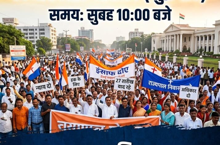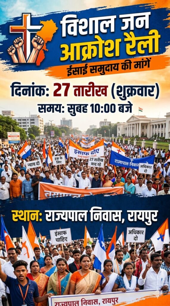 ईसाई समुदाय द्वारा न्याय, सुरक्षा और अधिकारों की मांग को लेकर 27 मार्च (शुक्रवार) को राजधानी रायपुर में एक विशाल जन आक्रोश रैली का आयोजन किया जा रहा है। यह रैली सुबह 10:00 बजे राज्यपाल निवास से संबंधित स्थान पर आयोजित होगी, जहां बड़ी संख्या में लोगों के शामिल होने की संभावना है।